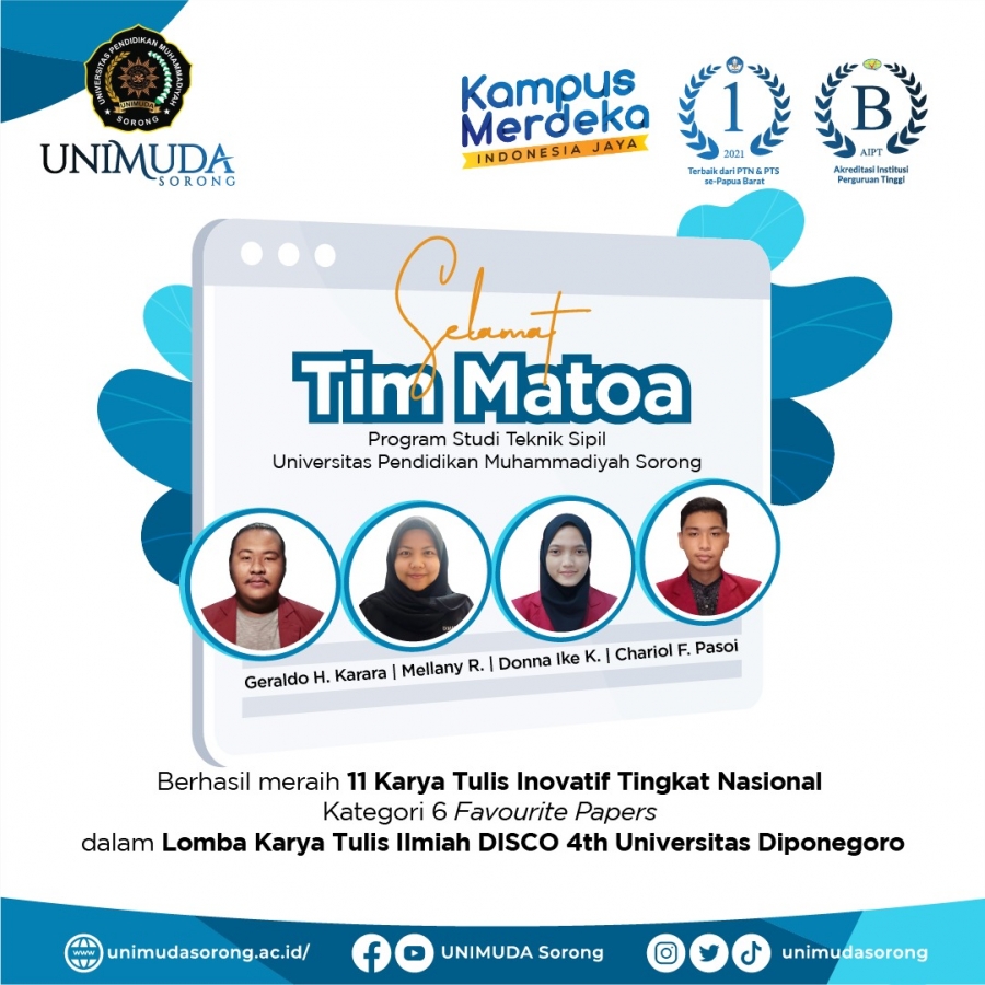Tim Karya Tulis Ilmiah dari Universitas Pendidikan Muhammadiyah UNIMUDA Sorong yang berhasil Lolos hingga meraih kategori 6 Favourite Papers pada Lomba Karya Tulis Ilmiah DISCO 4th Universitas Diponegoro tersebut, ialah Tim Matoa Unimuda. Tim Matoa Unimuda mengambil judul Karya Tulis Ilmiah yaitu Perancangan Sistem Rain Water Harvesting di UNIMUDA Sorong dan berhasil meraih 11 Karya Tulis Inovatif Tingkat Nasional dan masuk ke dalam kategori 6 Favourite Papers.