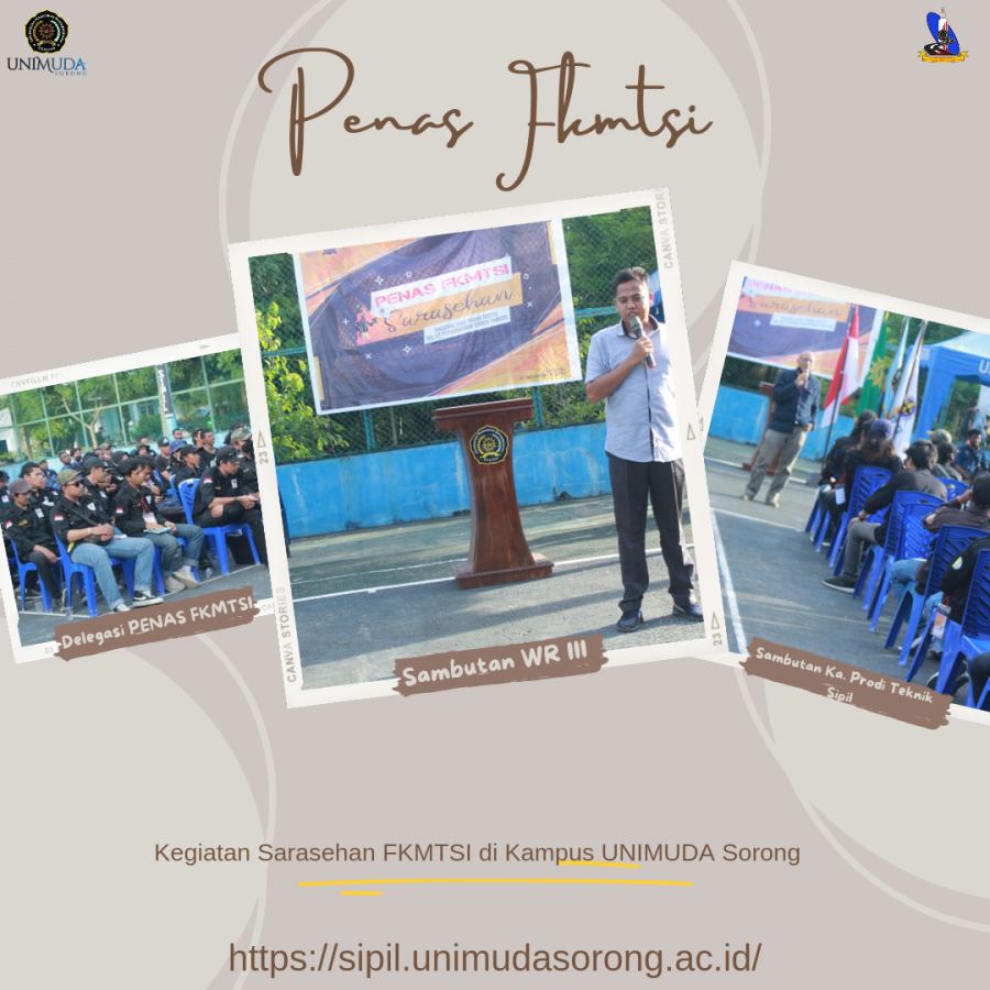 HMTS UNIMUDA dipercaya menjadi salah satu panitia pelaksana kegiatan PENAS FKMTSI, yaitu kegiatan SaraSehan dengan tema Maksimalisasi Peran FKMTSI dalam Pembangunan dimasa Pandemi. Kegiatan dibuka oleh Wakil Rektor III UNIMUDA Sorong, Bapak Sirojjudin, M.Pd. dan berlangsung dengan agenda Sharing Session singkat bersama Deklarator FKMTSI pada Tahun 1987 sekaligus Kaprodi Teknik Sipil UNIMUDA Sorong, Bapak Ir. Eko Tavip Maryanto, M.T.[mr]