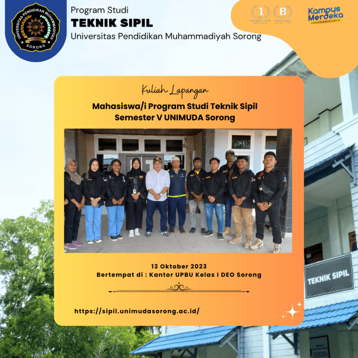 Teknik Sipil UNIMUDA Sorong | Mahasiswa Teknik Sipil Fakultas Teknik Universitas Pendidikan Muhammadiyah (UNIMUDA) Sorong berkunjung ke Kantor UPBU Kelas I DEO Sorong pada 13 Oktober 2023, agenda ini diterima baik oleh Pimpinan Kantor UPBU Kelas I DEO Sorong Cece Tarya, S.T. selaku Kepala Unit Penyelenggara Bandar Udara (UPBU) Kelas I Domine Eduard Osok (DEO) Sorong. Agenda ini hanya berlangsung selama satu hari dan hanya diwakili oleh beberapa mahasiswa Semester V (Angkatan 2021). [mr]