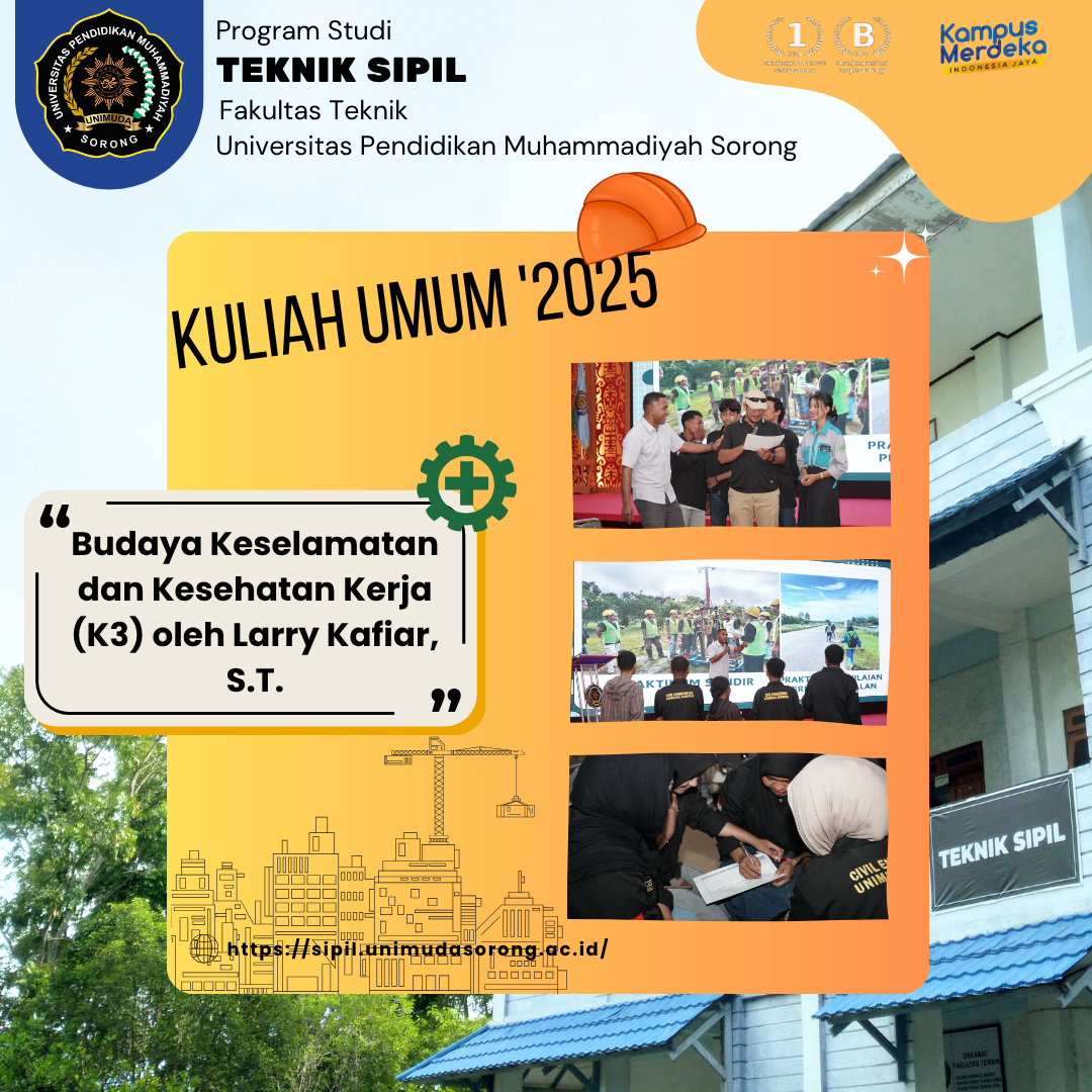 Teknik Sipil UNIMUDA Sorong | Fakultas Teknik UNIMUDA Sorong mengadakan Kuliah Umum bagi Mahasiswa/i Teknik Kimia dan Teknik Sipil dengan tema "Budaya Keselamatan dan Kesehatan Kerja (K3) bersama Praktisi Keselamatan dan Kesehatan Kerja (Larry Kafiar, S.T.) Agenda Kuliah Umum berlangsung selama 2 sesi, sesi 1 yaitu pada tanggal 26 April 2025 dan sesi 2 dilaksanakan pada 18 Juni 2025. Mengangkat tema K3 pada kuliah umum kali ini, Larry Kafiar, S.T. berbagi ilmu serta pengalaman yang dimiliki kepada mahasiswa/i Teknik Kimia dan Teknik Sipil.