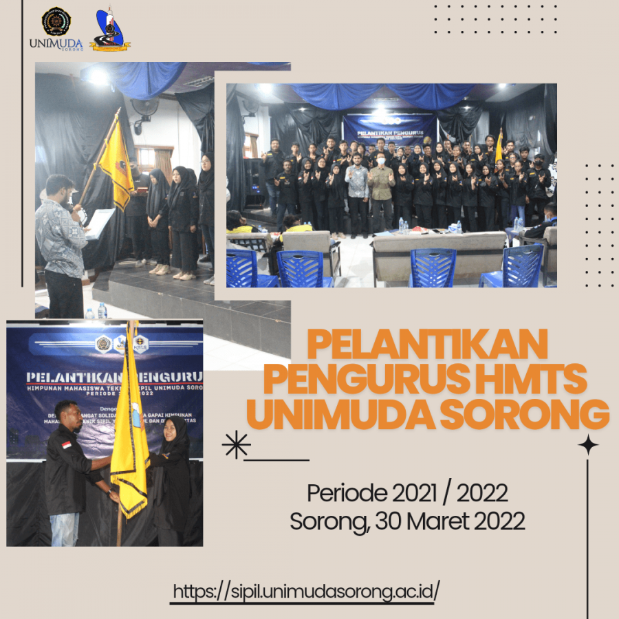 Teknik Sipil UNIMUDA Sorong | Himpunan Mahasiswa Teknik Sipil (HMTS) UNIMUDA Sorong mengadakan Pelantikan bagi Kepengurusan Himpunan yang baru yaitu Periode 2021 – 2022 pada 30 Maret 2022. Sebanyak 38 Mahasiswa Teknik Sipil yang tergabung dalam Kepengurusan HMTS yang baru dilantik oleh Sekretaris Program Studi (Mewakili Kaprodi Teknik Sipil UNIMUDA), Bapak Andi Rahmat, S.T. M. Eng. Dan kegiatan Pelantikan pun turut mengundang Dekan Fakultas Sains & Teknologi, Bapak Yusup Sopian, S.Pt. M.Sc.