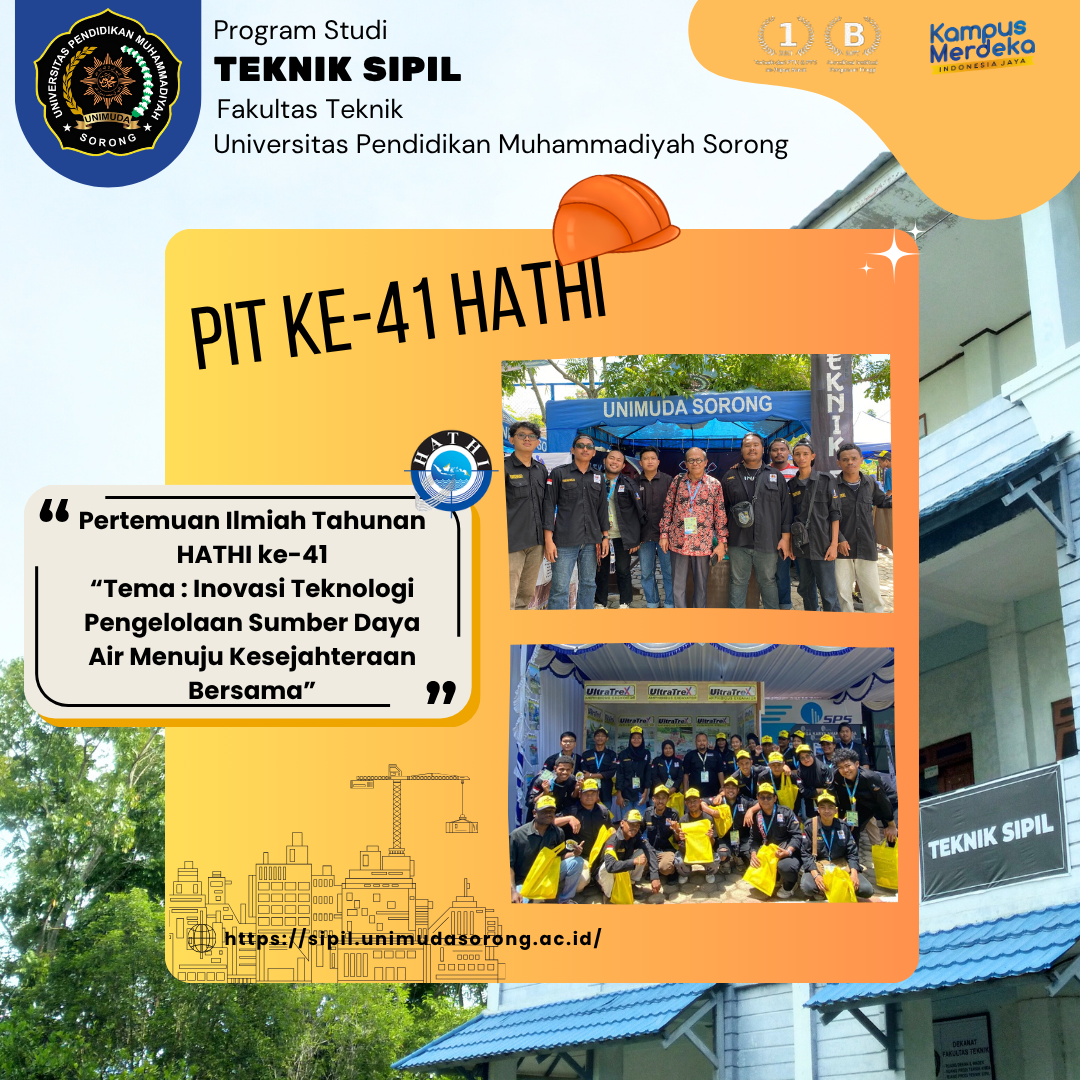 Teknik Sipil UNIMUDA Sorong | Pertemuan Ilmiah Tahunan (PIT) Himpunan Ahli Teknik Hidraulik Indonesia (HATHI) ke - 41 di laksanakan di Kota Sorong, Papua Barat Daya pada tanggal 27-30 September 2024 tepatnya di Universitas Pendidikan Muhammadiyah (UNIMUDA) Sorong. PIT HATHI 2024 mengusung tema "Inovasi Teknologi Pengelolaan Sumber Daya Air menuju Kesejahteraan Bersama". Mahasiswa Teknik Sipil berkesempatan menjadi salah satu tim Panitia kegiatan selama kurang lebih 3 hari di Kampus UNIMUDA Sorong, hal ini disambut baik oleh Ka. Prodi Teknik Sipil (Elfiyusriningsi Syara, M.T.) diharapkan dari ke ikutsertaan mahasiswa Teknik Sipil pada Kegiatan PIT HATHI ke-41 ini dapat memberikan suatu pelajaran serta pengalaman yang baik bagi tim Mahasiswa/i.