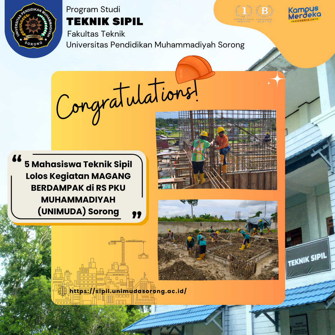 Teknik Sipil UNIMUDA Sorong | Lima Mahasiswa Teknik Sipil Fakultas Teknik UNIMUDA Sorong berhasil LOLOS dalam kegiatan MAGANG BERDAMPAK Tahun 2025 bertempat di RS PKU MUHAMMADIYAH (UNIMUDA) Sorong. Mahasiswa yang berhasil lolos yaitu: