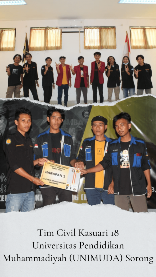 Tim Civil Kasuari 18 yang beranggotakan 3 Mahasiswa Teknik Sipil Universitas Pendidikan Muhammadiyah UNIMUDA Sorong terdiri dari Aleksius Mitan, Chabiburrahman, dan Yusro Nur Hamdani berhasil meraih Juara Harapan I dengan mengambil judul karya yaitu “Gazebo Knock Down Modern”.